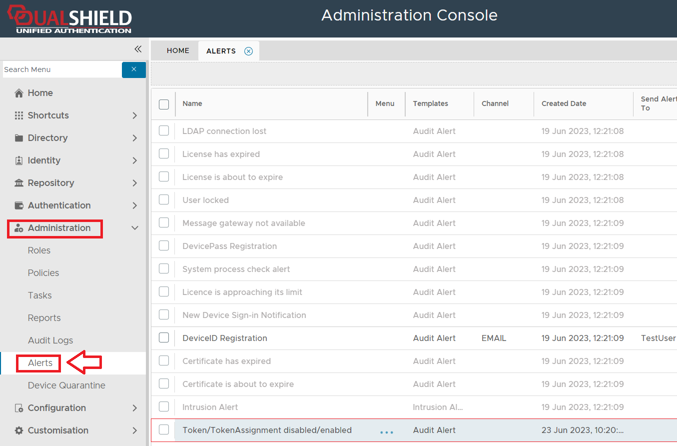 The alert can be found by navigating to "Administration | Alerts", then scrolling down to the alert "Token/Token Assignment disabled/enabled";