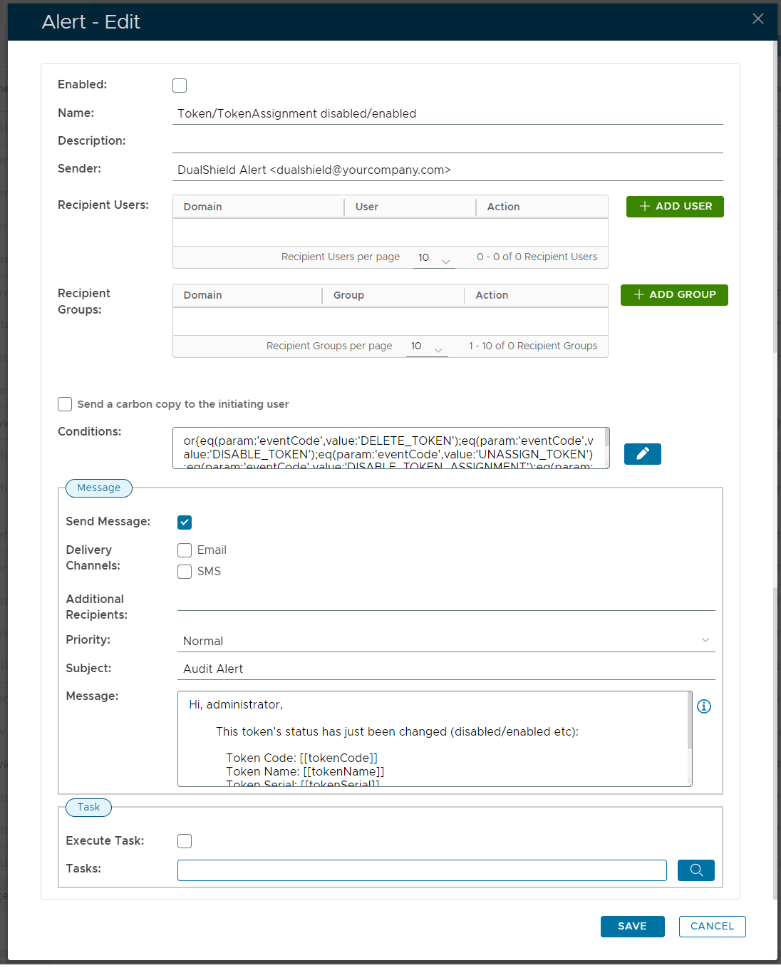 The Token/Token Assignment disabled/enabled" alert is triggered whenever the system detects a token or token assignnment has been enabled or disabled, but you might not always want notifications to be sent to your specified users every time this event occurs.