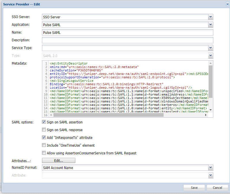 In the Juniper SA management console, open the newly created SAML authentication server.