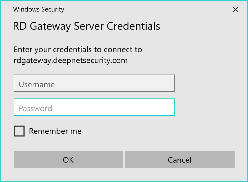 It redirects to your RD Gateway server, e.g. "rdgateway.deepnetsecurity.com", and prompts for your login credentials: