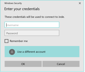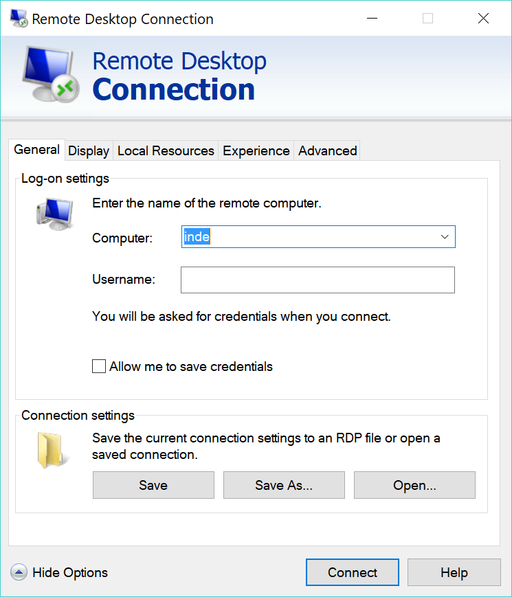 Open a Remote Desktop Connection, enter the name of the remote computer that you want to connect to , e.g. "inde"