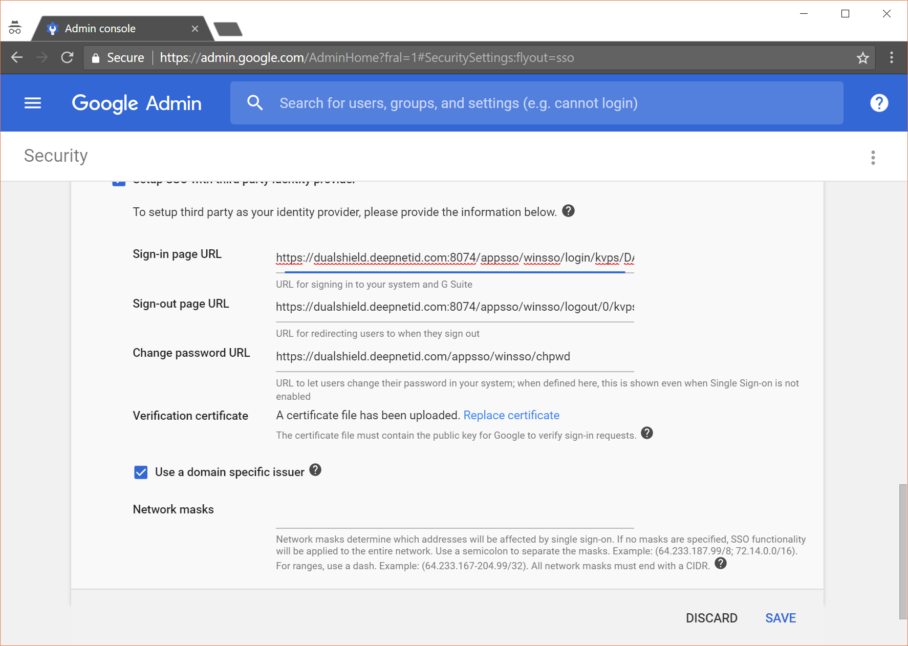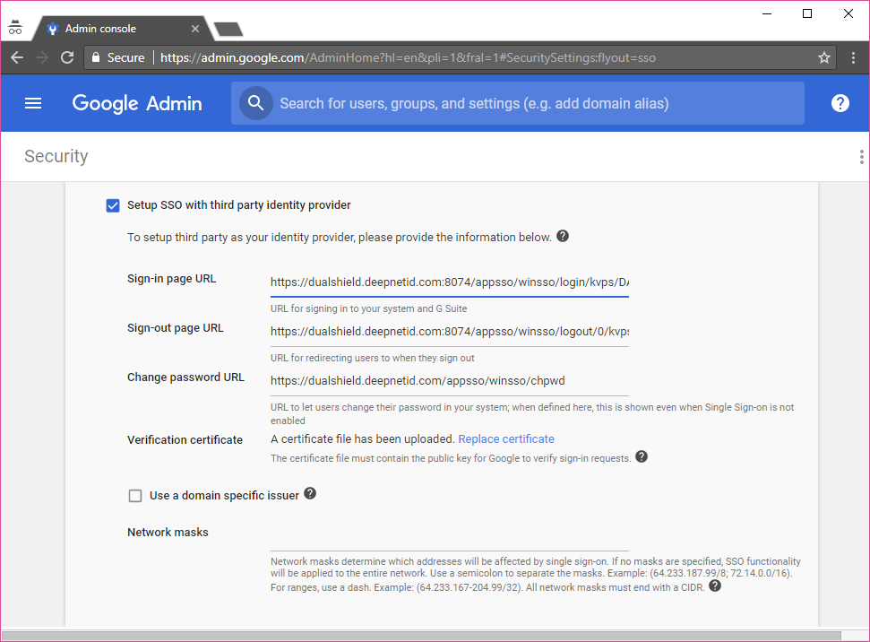 In the above URLs, replace "dualshield.deepnetid.com" with the URL of your DualShield SSO server. Also, replace "GoogleApp" with the application name of Google Apps in your DualShield server. - Click the "Replace certificate" link