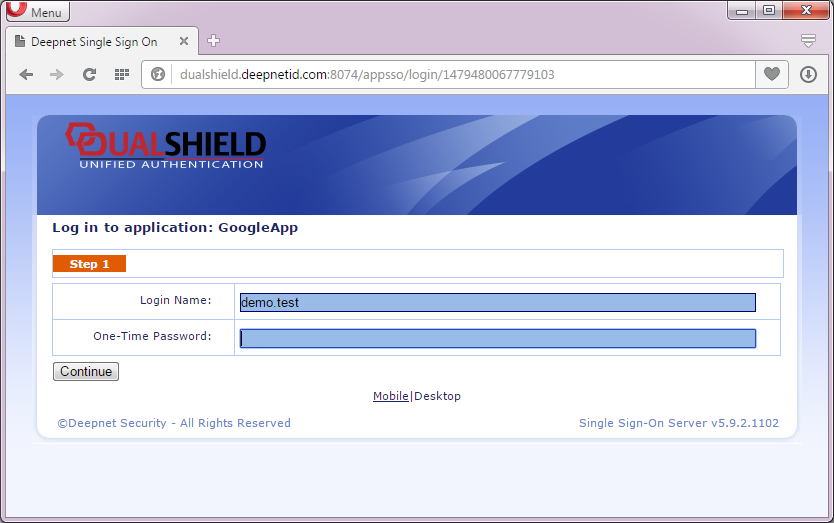 Once your web or cloud applications are integrated with the DualShield SSO server, when a user attempts to login to your applications e.g. http://mail.google.com/a/deepnetid.com the request is automatically redirected to DualShield SSO.