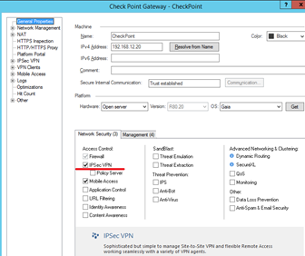 In the General Properties, Network Security tab, enable “IPSec VPN”.