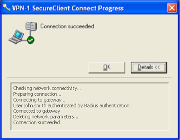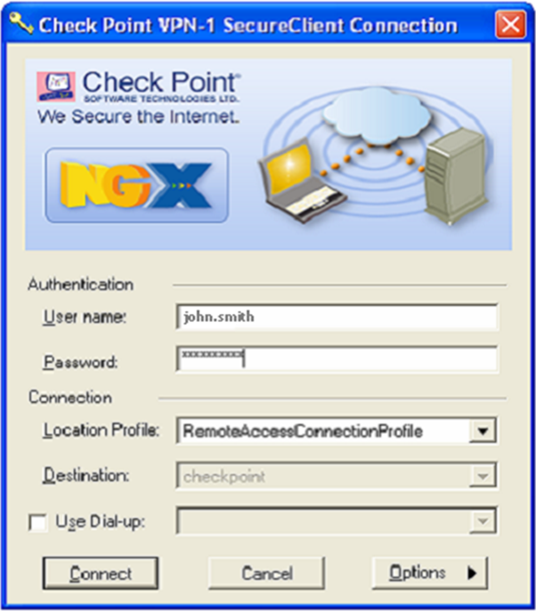 - Start the Check Point VPN-1 SecureClient. Enter the user name "john.smith" and user's AD password. Click "Connect".