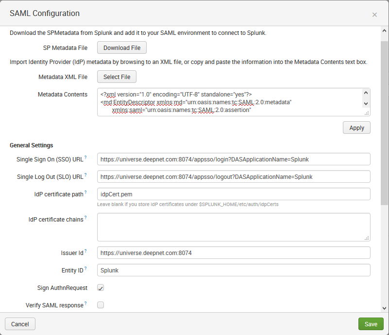 To work around this bug, deselect the option "Verify SAML Response". However, If you prefer to verify SAML response, then check the last section "Verify SAML Response using the IdP's CA certificate". - In the "Entity ID" field, provide an ID for the the SP, e.g "Splunk"