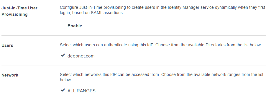 - Select which users can authenticate using this IdP, i.e. deepnet.com
