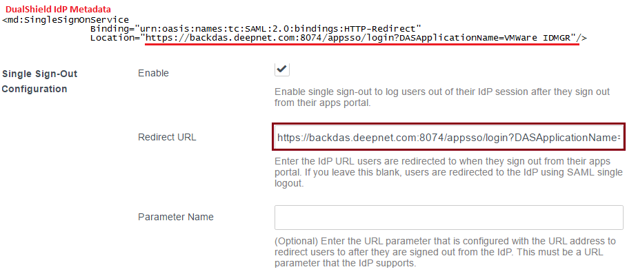 - Copy the "SingleSignOnService Location URL" in DualShield IdP Metadata which was downloaded earlier. i.e. "https://backdas.deepnet.com:8074/appsso/login?DASApplicationName=VMWare IDMGR" into "Redirect URL" field.