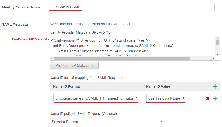 - Copy the "DualShield IdP Metadata" which downloaded earlier into the "SAML Metadata" field.