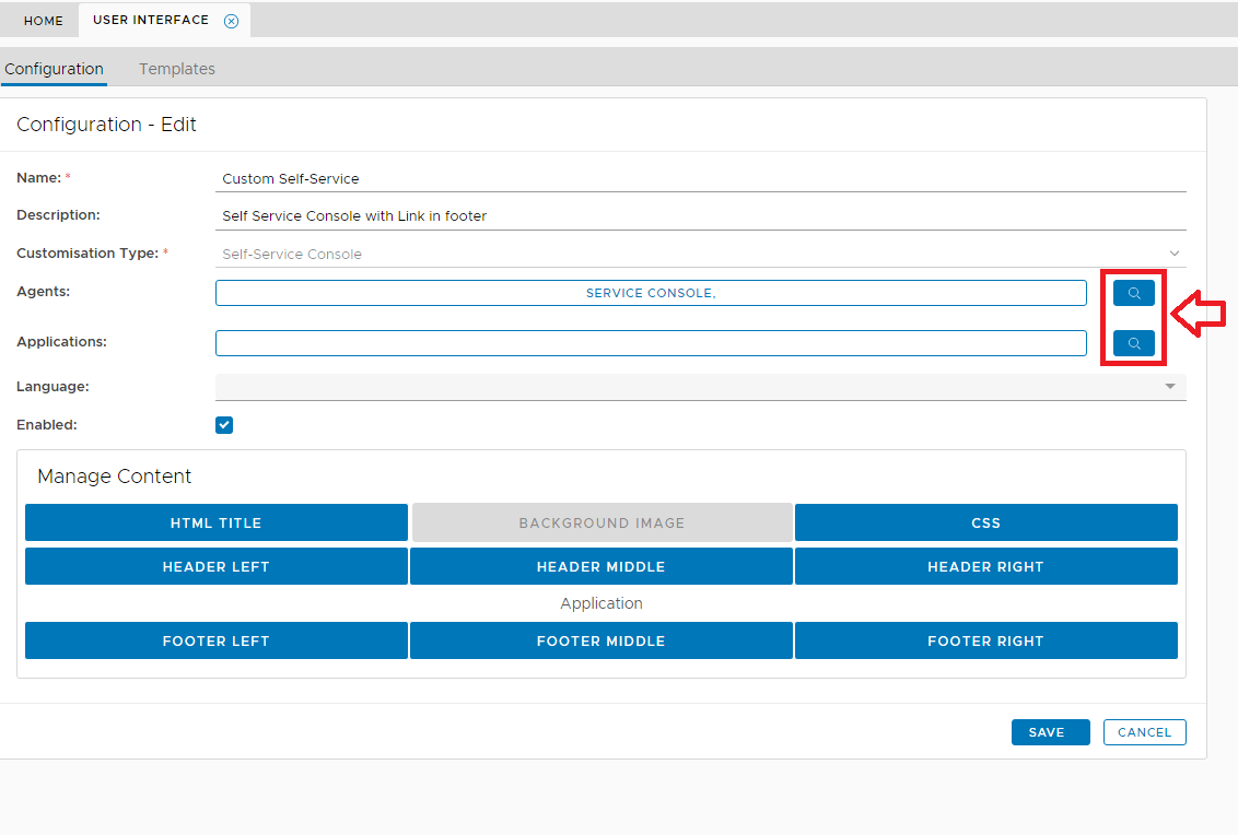 At the prompts "Name:" and "Description:" provide text that relates to the customisation you are about to perform, then at the prompt "Customisation Type:" select which portal is to be customised, then at the prompts "Agents:" and "Applications" click on the search icons (see arrow in the picture above), then select the agent and application that matches your selected customisation type;
