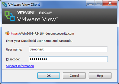 When a user attempts to connect to a VMware View Server that has DualShield two-factor authentication enabled and the DualShield is configured to authenticate users by one-time passwords, they are first presented with a login prompt as shown below: