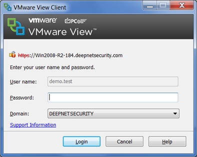 When a user attempts to connect to VMware View Server, they are first presented with a login prompt as shown below:
