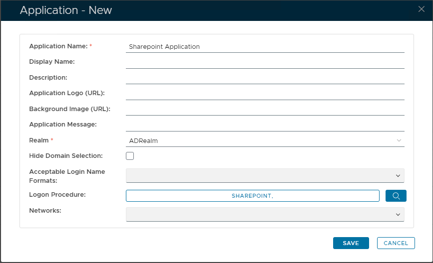 - Select the Sharepoint "Application" created previously