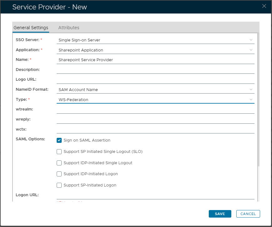 - Select 'Type' as "WS-Federation"