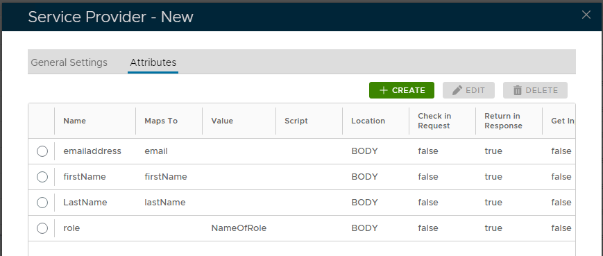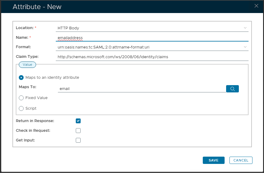 Next create 'Identity Claims attributes' that will be mapped to AD Attributes. There would usually be 3 attributes, containing emailaddress, givenName and Surname (see SSO Script article)