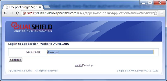 Clicking the link "click to access protected page", you'll be redirected to the DualShield SSO server to be authenticated with TFA: http://dualshield.deepnetlabs.com/...