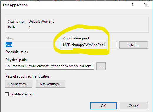 Assume we are troubleshooting OWA, look at its "Basic Settings.." in IIS Manager, get its application pool name.